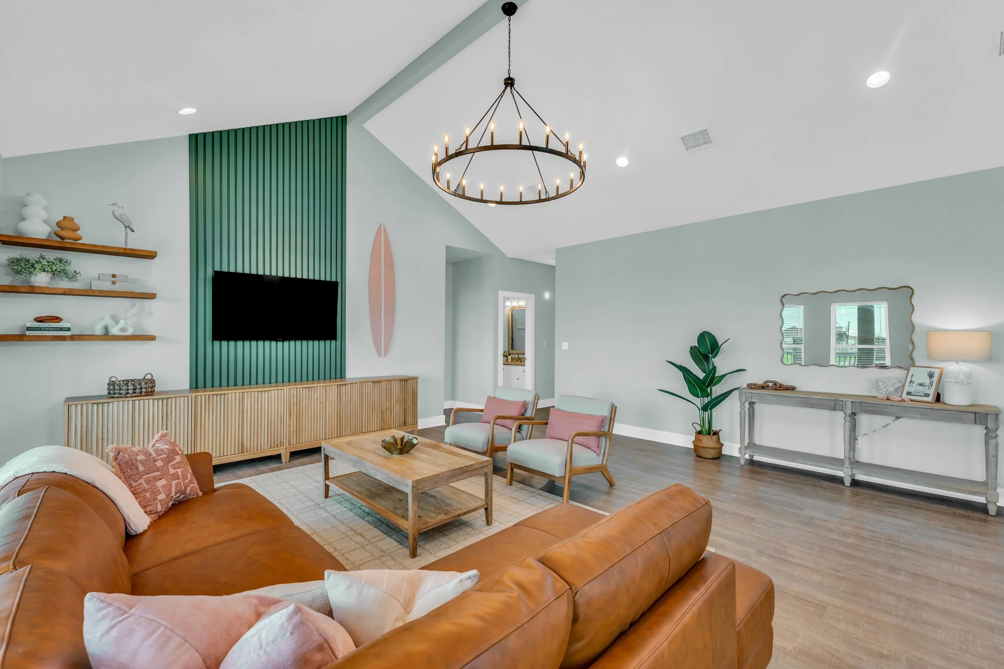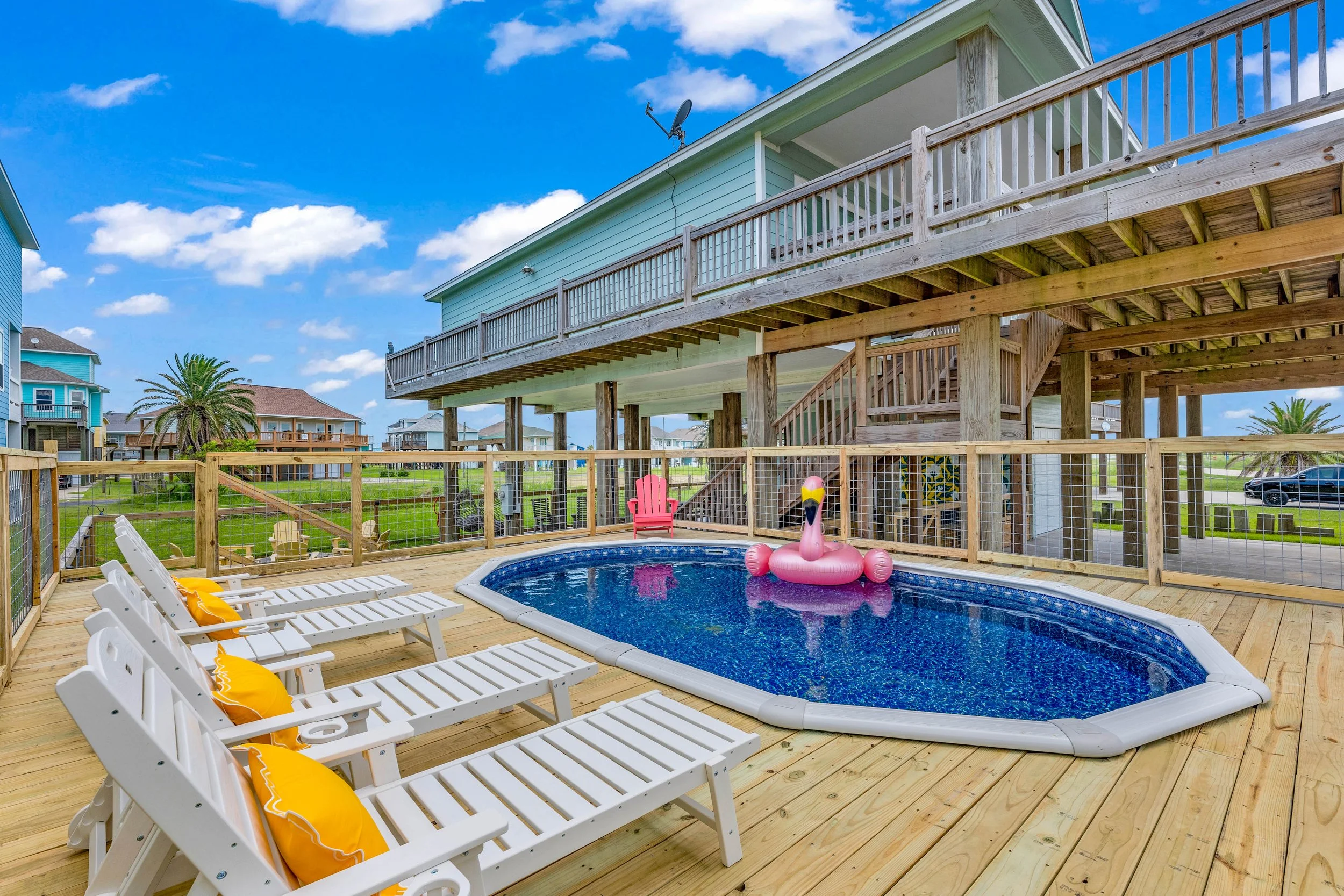 The converted garage is now a game room paradise! A large TV with Roku lets you stream your favorite shows or play video games (bring your own logins or consoles). Challenge your friends to a game of basketball or cornhole, or relax in the unique hammock net above the floor. The pièce de résistance? A thrilling 9-foot spiral slide that takes you straight to the poolside!